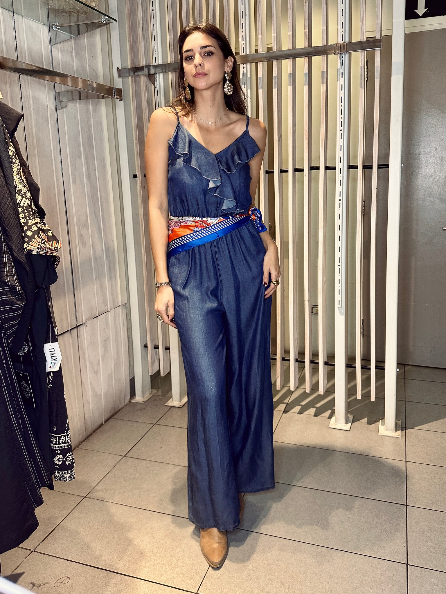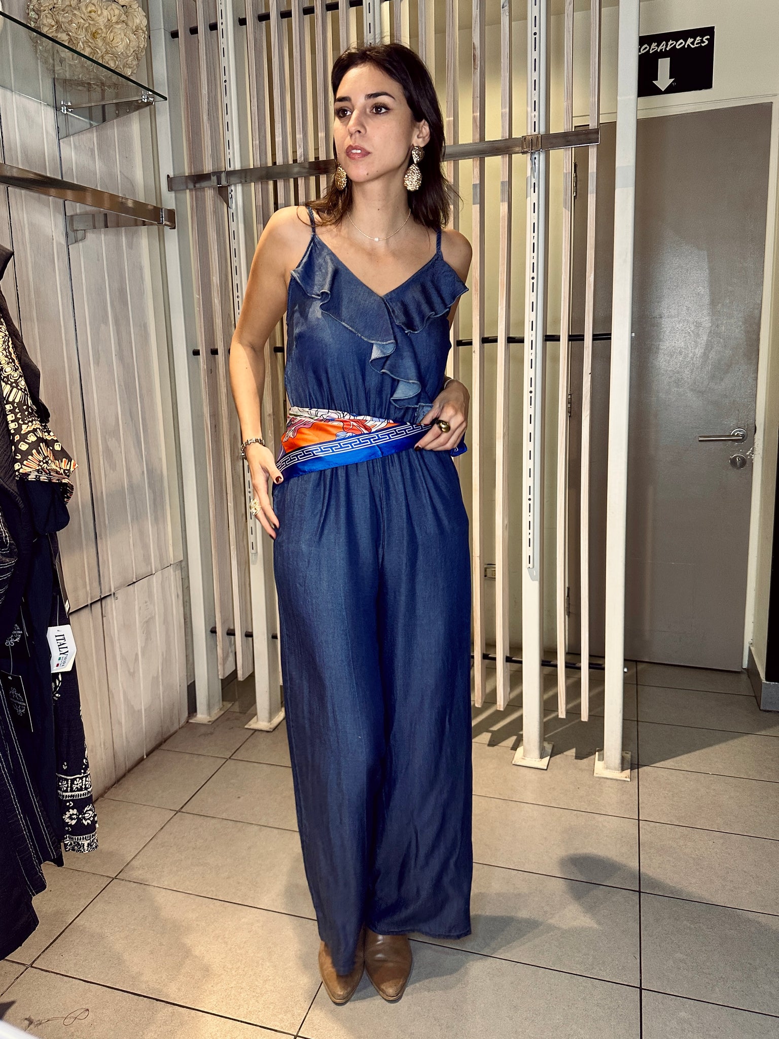 Enterito de Tencel Hecho en Italia, escote V con tirantes y vuelo en el pecho.
