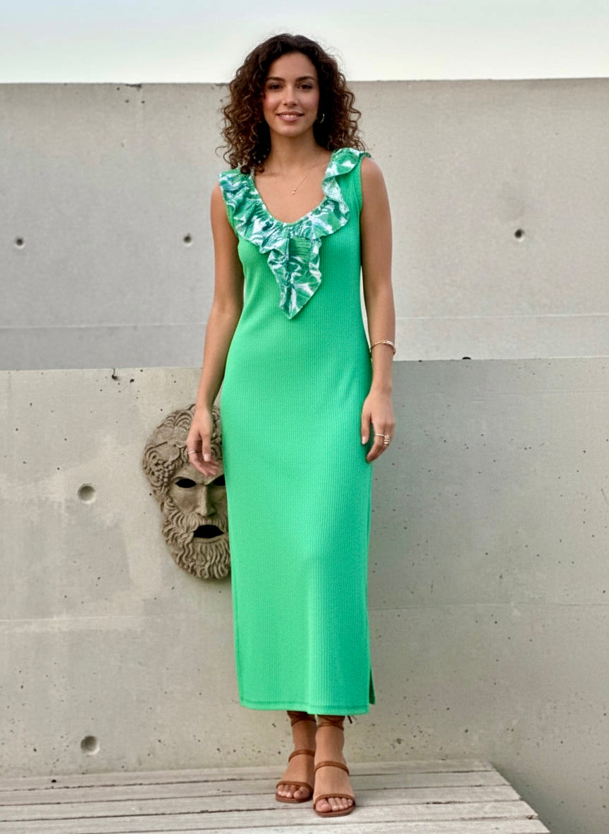 Vestido Largo, Recto con Vuelo en Escote. Hecho y diseñado en Chile por Cándida y Narcisa en 3 combinaciones disponibles.